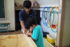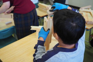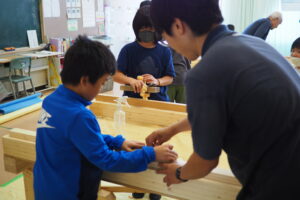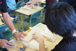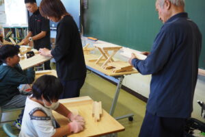 大工の仕事紹介の後、折り畳みのイスをみんなでつくり、カンナ削りの体験もしていただきました。