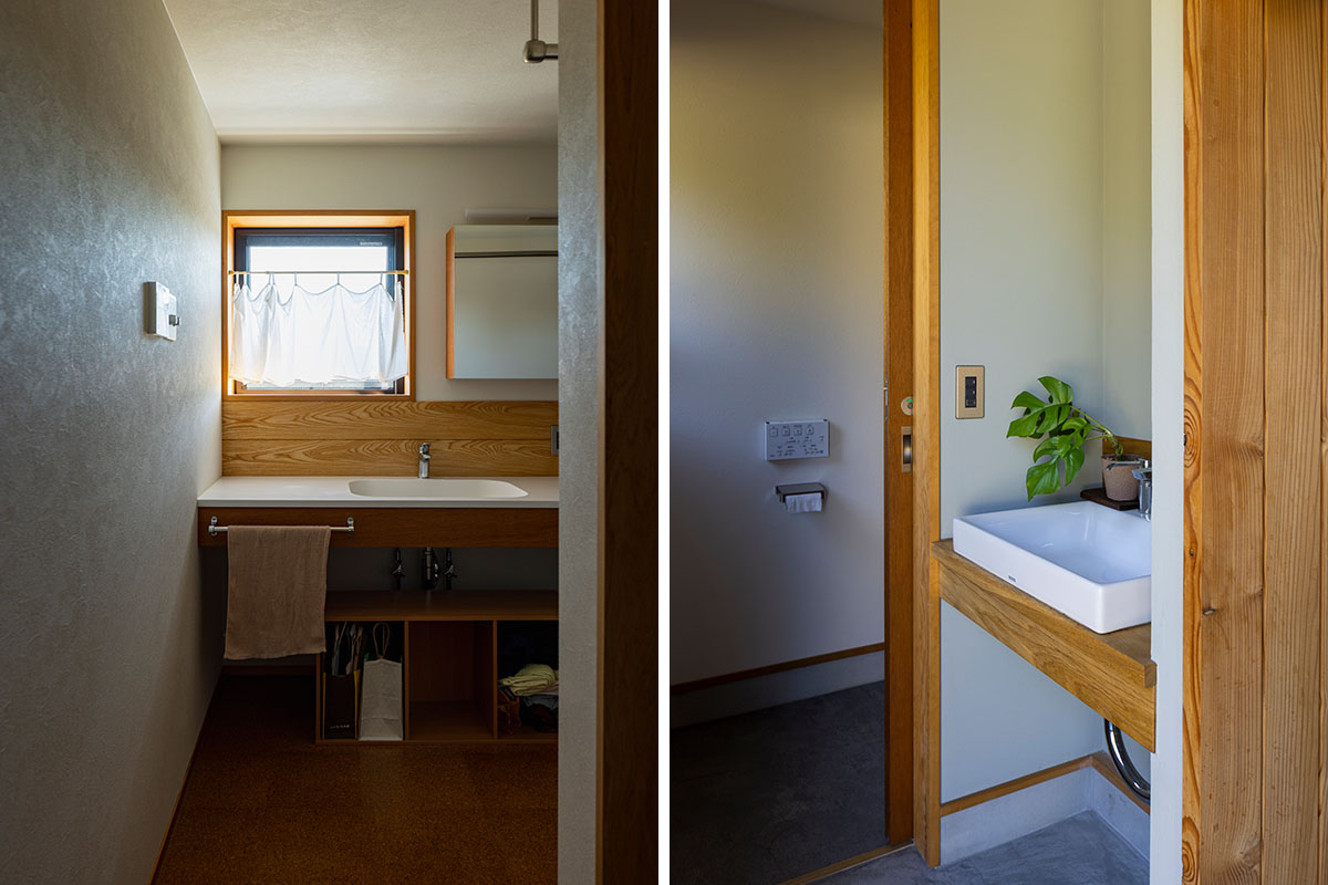 左:ワイドスパンの造作洗面台を設えた2階ユーティリティは、洗濯室も兼ねる。右手手前は、浴室