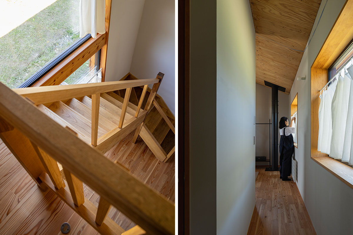 左:居住スペースの階段は、吹き抜けの3連窓からの自然光がきれいに射すようにスケルトン仕上げに。武部建設でストックしていたナラとタモ、キハダ、エンジュの無垢材を使用し、親柱の婆娑羅(ばさら)継ぎという伝統手法で材をつなぎ合わせて意匠とした