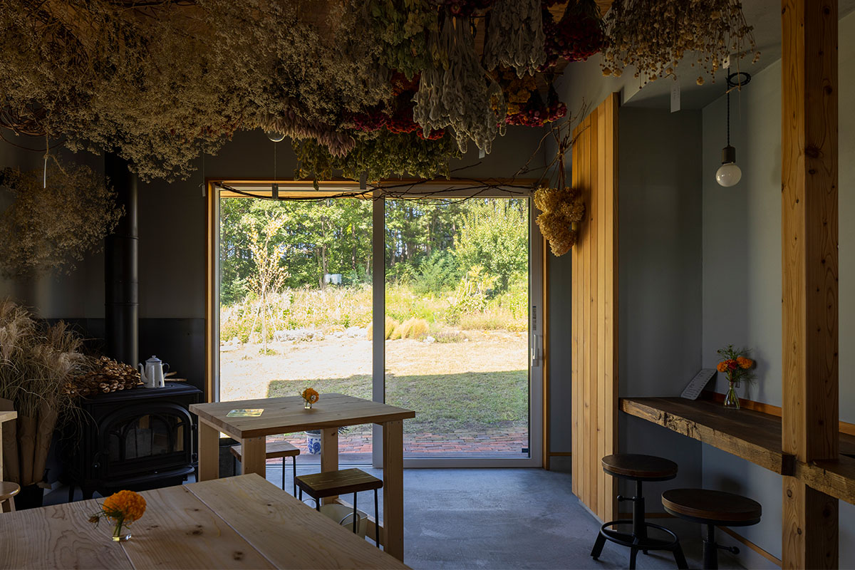 庭との一体感、動線の良さを実現する大開口を設けた店舗スペース。掃除のしやすい土間仕上げの床には、ヨツールの薪ストーブも設置。木とモルタル、珪藻土で仕上げたシンプルな箱のような店内を、奥さんが育てた色鮮やかな花々と多肉植物が彩る