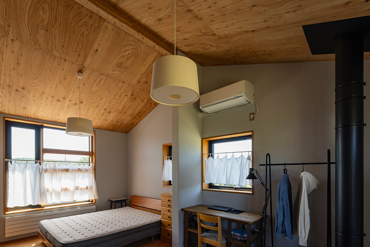 カラマツの屋根なり勾配天井の寝室。Hさんの書斎としても活用できるよう、窓にはデスクも備えた。冬は開口からの陽射しと薪ストーブの煙突から伝わる熱が空間を優しく暖める