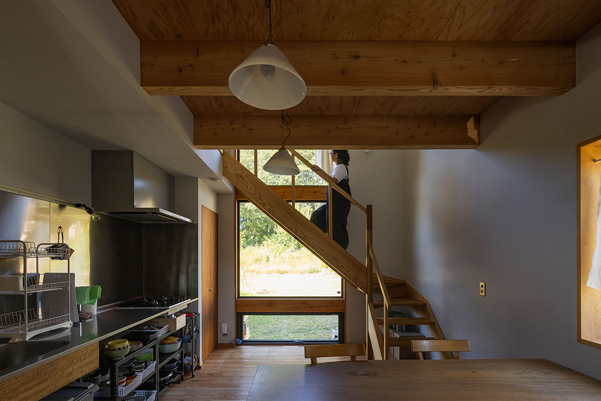 現しの梁にガイシ配線を採用したダイニング・キッチン。住まい手の使い勝手に柔軟に寄り添えるよう、キッチンの設備も最小限にとどめた