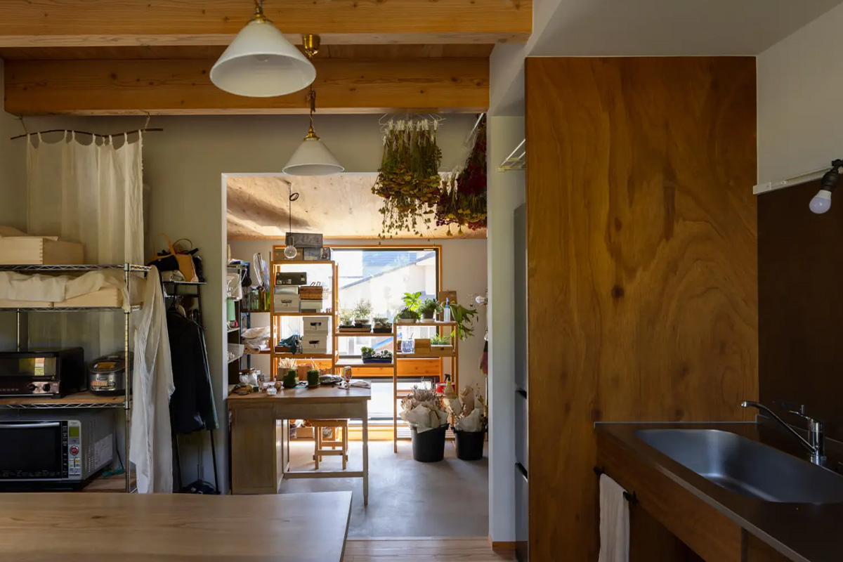 「リフォーム以来、武部建設がいつも近くで住まいを見守ってくれているという安心感があり、迷うことなく新築をお願いしました」。そう語る奥さんは、プランづくりにあたり、植物がスクスクと育つ職住一体の住まいを要望しました。また、1階に薪ストーブを備えた庭と一体となる店舗スペースを設け、いずれ夫婦2人暮らしになる居住スペースはミニマルに、内外装にはできる限り木をたくさん用いたいと伝えました。武部建設は、庭や雑木林を室内からも存分に楽しめる開口プランや古建具や新旧のストック材をポイントに用いた内装仕上げを提案。「つたない言葉で伝えた要望も、武部建設はしっかり読み取って、思い描いていた以上の提案をたくさんしてくれました」と、奥さんはプラン時を振り返って話します。