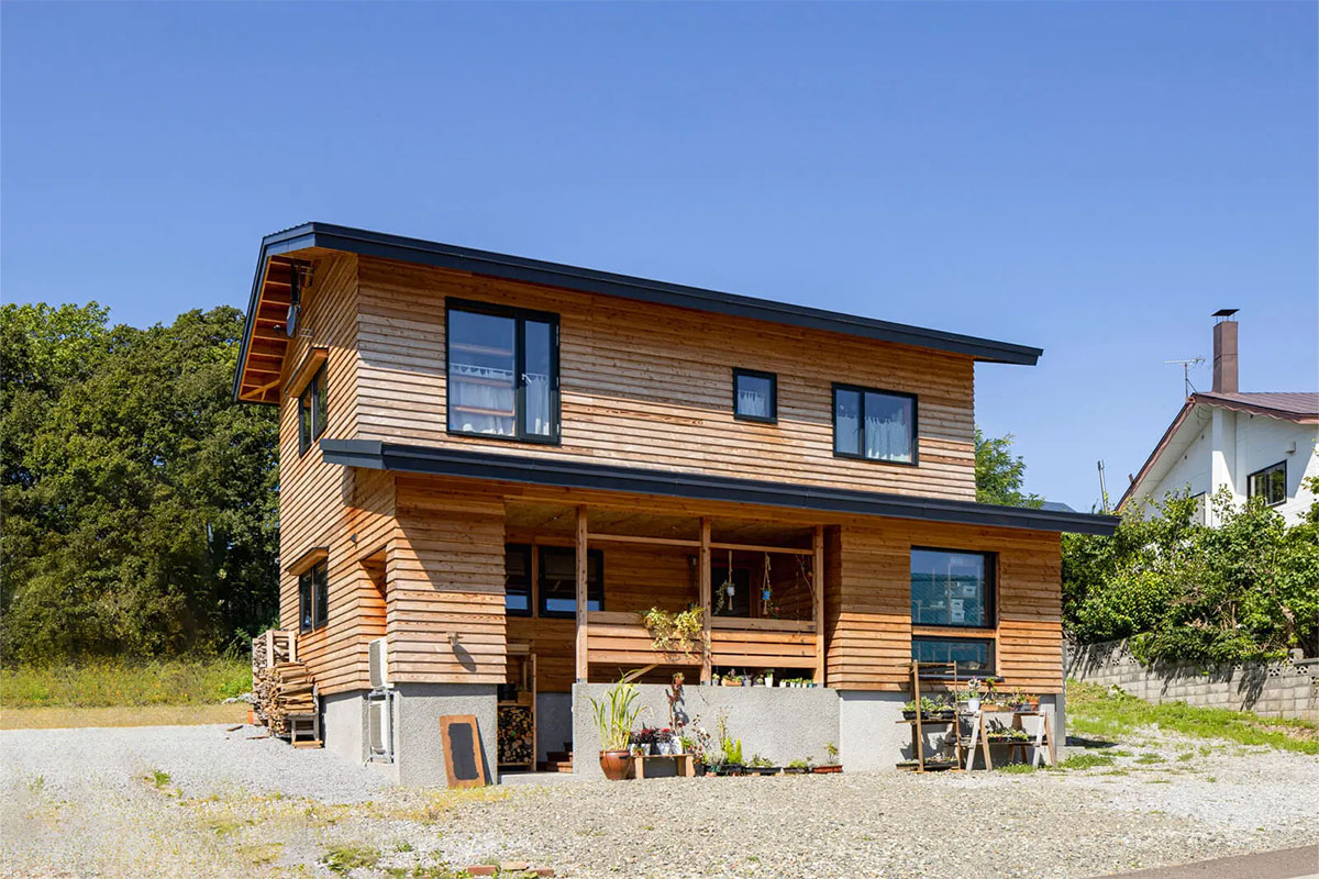 傾斜地の土地なりに設えた建物は、緩やかな坂道を上り、見えた景色にすっきり納まる配置にこだわった。外壁は経年変化が楽しめるカラマツ荒木材の下見板張り