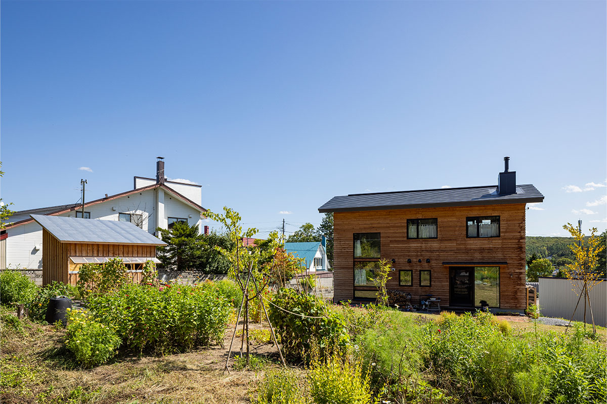 雑木林を背景に広がる庭には、住まいの外壁とそろえたカラマツ板張りの小さな作業小屋も造作。「当初はコンテナを購入する予定でしたが、武部建設に相談したら、予算内で造作してくれることになりました。おかげで、住まいと調和のとれた庭になりました」。